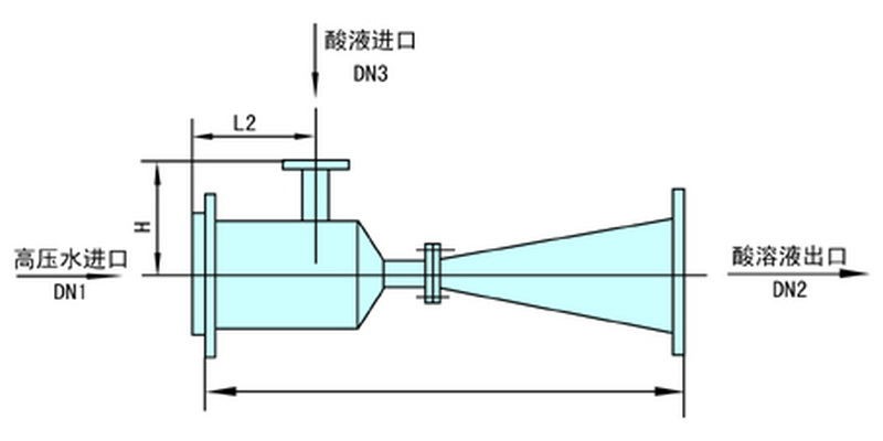 高壓原水通過管道閥門進入噴射器的漸縮段,將靜壓頭轉換成動能,在噴嘴處成為高速射流,使混合室形成微真空狀態,將高濃度的再生藥液吸入混合室,并使再生藥液的壓力和速度發生變化;在混合段內,水和藥液得到充分地混合,然后注經擴散段,使再生液減低流速,靜壓頭升高,再通過出口管道及閥門將稀再生液送到交換器本體中。